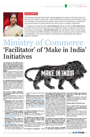 ‘Facilitator’ of ‘Make in India’ Initiatives SP’s Naval Forces (SP’s): When you say ‘Make in India’ what exactly is the destination – (a) to get foreign OEMs to manufacture the military platforms in India for Indian market and (b) to get foreign OEMs to manufacture for the overseas markets? Ministry: The main objective of the ‘Make in India’ campaign is to transform India into a global design and manufacturing hub. The products manufactured in India can be used for domestic consumption and can be exported as well. SP’s: What all incentives the foreign OEMs are supposed to get under the campaign? Ministry: As per the extant Defence Procurement Procedure 2013, foreign direct investment (FDI) in joint ventures with Indian enterprises is considered as an eligible avenue for discharge of offset obligations in India. SP’s: In view of creating a solid Indiabased industrial complex, what all steps are being taken? Ministry: The government has taken the following initiatives in order to build an indigenous defence manufacturing base in India: zz Liberalisation of FDI cap in defence manufacturing. FDI up to 49 per cent is allowed under the automatic route. FDI beyond 49 per cent is allowed under government route on a case to case basis, which is likely to result in access to modern and state-of-the-art technology in the country. zz Issue of list of equipment requiring an industrial licence and liberalising regulations. The detailed list can be accessed from the link pasted (http:// dipp.nic.in/English/acts_rules/Press_ Notes/pn3_2014.pdf) zz Finalisation of security manual for licensed defence industry? The security manual can be accessed from the link pasted (http://ddpmod.gov.in/ showfile.php?lid=151) zz Increase in initial validity of industrial licence? The initial validity of industrial licence has been extended to 15 years, which is further extendable up to