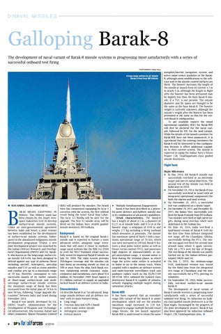 successfully test-fired at an electronic target and met its initial objectives. The second test of the missile was held in India later in 2010. zz On November 10, 2014, the Barak-8 was successfully test-fired in Israel with all integrated operational components for both the marine and land system. zz On November 26, 2015, a successful test was conducted on a drone target. zz On December 29, 2015, and December 30, 2015, the Indian Navy successfully testfired the Barak-8 missile from INS Kolkata. Two missiles were fired at high speed targets, during naval exercises which were undertaken in the Arabian Sea. zz On June 30, 2016, India test-fired a land-based version of Barak-8 SAM for the first time from defence integrated test range, off the Chandipur, Odisha, successfully hitting the PTA. The missile was again test-fired for second time around noon where it again successfully hit a PTA over the Bay of Bengal. The test-firing of the missile was jointly carried out by the Indian defence personnel, DRDO and IAI. zz On July 1, 2016, the medium-range SAM, land-based version was tested for the third time from the integrated test range at Chandipur and the missile successfully hit a PTA, proving its reliability. zz On September 20, 2016, India successfully test-fired surface-to-air missile Barak-8. The development of naval variant of Barak-8 missile systems is progressing most satisfactorily with a series of successful onboard test firing. Its induction on Kolkata class guided missile destroyers is at the final stages. Encouraged by the progress of the joint development project, Barak-8 has also been approved for induction onboard Project 15B, Visakhapatnam class. SP