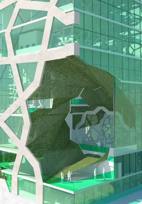 By creating different types of green spaces in the building to provide an experience that people can engage with geenery and function ser- vies at the same time. The Islamic tessellation, though our study, applied though twisting and extruding, provided dimension and depth for the lights to come through.