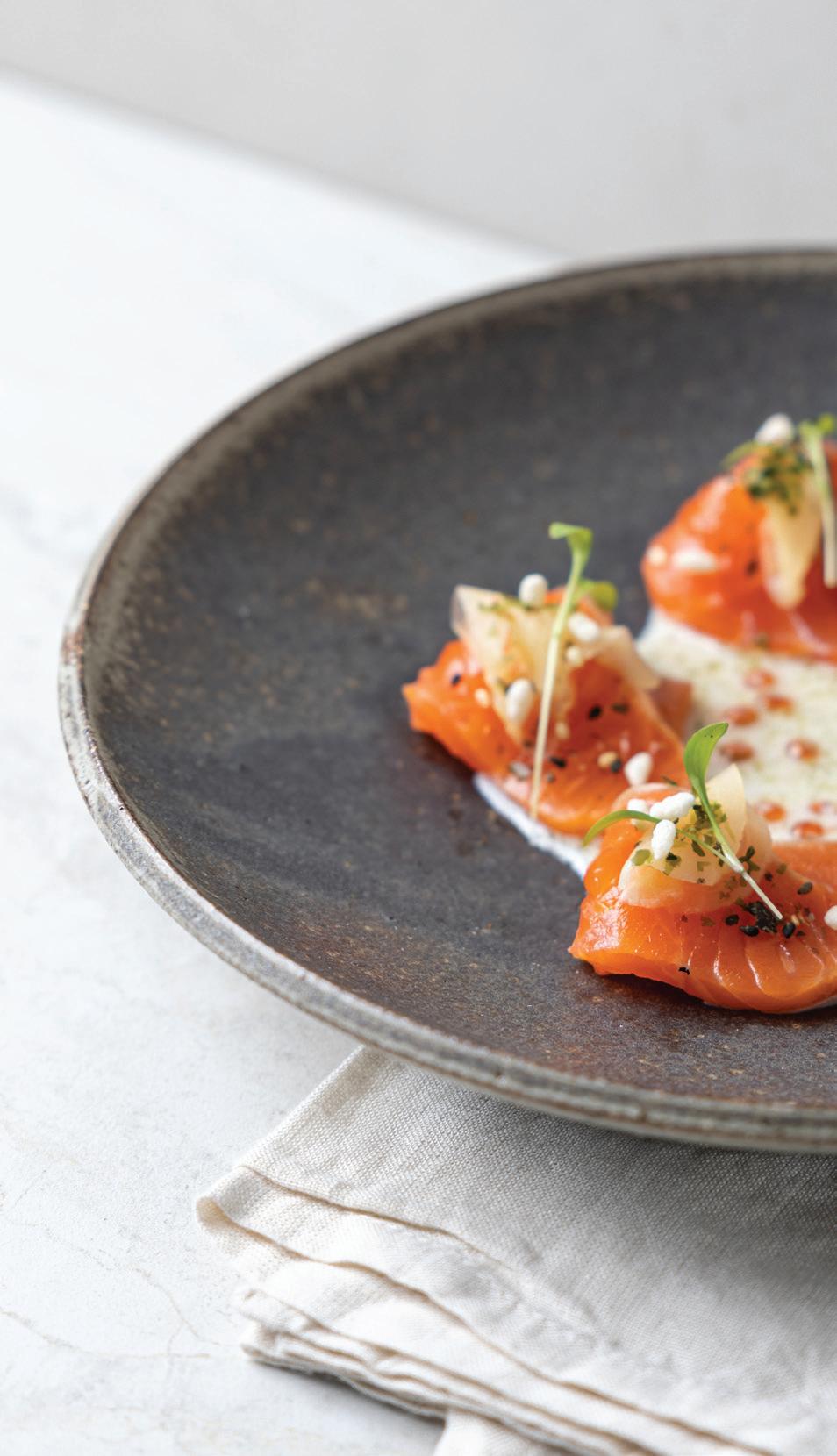 Lightly cured Ora King salmon, buttermilk dashi, pickled ginger, furikake, puffed quinoa, lemon myrtle oil