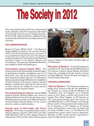 The Society in 2012 The events of the Society in 2012 were characterised by the celebration of the 50th anniversary of the death of the Founder of the Society of Christian Doctrine, M.U.S.E.U.M., Saint George Preca, whilst the Society continued with enthusiasm its apostolate wherever it is present. THE ADMINISTRATION Regional Chapter (Malta) 2012 - The Regional Chapter (Malta) was held on 13th and 14th October 2012 at the Good Samaritan Home, St Venera. It was presided by the Superior General. The delegates analysed and approved reports drawn by the Regional Executive Council on the Region’s Boards and Commissions. The proposals submitted by Members were studied in detail and decided upon. Extraordinary General Chapter 2013 - The announcement of the Extraordinary General Chapter for both Sections together, scheduled to open on 1st April 2013, was read by the Superior General of the Female Section Mary Chircop on 7th November during a special meeting for Members and Candidates of the two Sections of the Society. Superior General Natalino Camilleri then delivered the talk for the occasion wherein he outlined the scope and the preparation for the General Chapter. New Assistant Superior General - Joseph Abdilla replaced Superior Nicholas Balzan who served as Assistant Superior General for the past three years. During the general meeting of 16th May the Superior General thanked Superior Balzan for the service which he carried out with dedication. Passing away of Abel Giglio and Victor Delicata - The Society mourned the death of Victor Delicata (Superior General 1983-2009) and Abel Giglio (Primarius 1983 to 1994, Assistant Superior General from 1994 to 2002). Victor Delicata passed