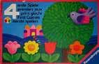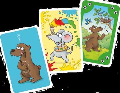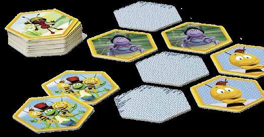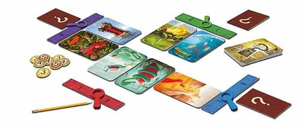 wiese. Auch hier ist das Spielsystem eingängig und kniffelig zugleich. Alle bekommen drei Handkarten mit sechs Blumenfeldern. Eine davon legen sie in ihre persönliche Auslage, wobei mindestens zwei Felder bereits Gelegtes überlappen müssen. Anschließend wird kontrolliert, ob man nun die Mehrheit in einer Farbe hat. In der Tischmitte liegen weitere Karten, die stets ein bis drei Wertungssymbole in einer Farbe zeigen. Solch eine Karte sammelt man ein, bevor man eine weitere Handkarte als neue Aufgabe für alle in die Mitte legt und auf drei Karten nachzieht. Eine kompakte, flott gespielte Neuheit.