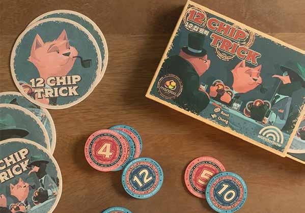 Unter den bemerkenswerten Stichspielen ist auch 12 Chip Trick bei Wonderbow. Es kommt ursprünglich aus Japan. Gespielt wird hier nicht mit Karten, sondern mit Pokerchips. Man könnte es auch mit 17 und 4 mit Farbund Zahlenscheiben umreißen. Darauf kommt es an: Deine Mitspieler sehen immer, welche Farbe deine Chips auf