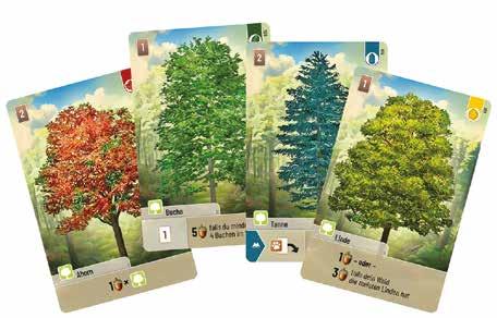 dener Baumsorten verzückt die Spielgemeinde bereits seit Herbst 2023. Denn die Bäume dienen als eigene Ökosysteme, an denen sich Tiere von Vögeln über Hirsche bis hin zu Wölfen einfinden und so Punkte liefern. Am Zug spielt man einen neuen Baum aus oder legt Karten im eigenen Wald an die Bäume, indem man sie zum Teil darunter schiebt. Alle Nicht-Bäume sind zweigeteilt: Entweder taucht rechts ein Hase oder links ein Fuchs auf. Welche Seite nutzt man? Oben flattern Schmetterlinge, unten buddeln Maulwürfe