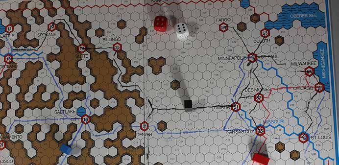 Mit abwischbarem Fettstift errichten die Spieler ihre Eisenbahnlinien in der ersten Spielphase. In der zweiten werden bestimmte Verbindungen befahren.