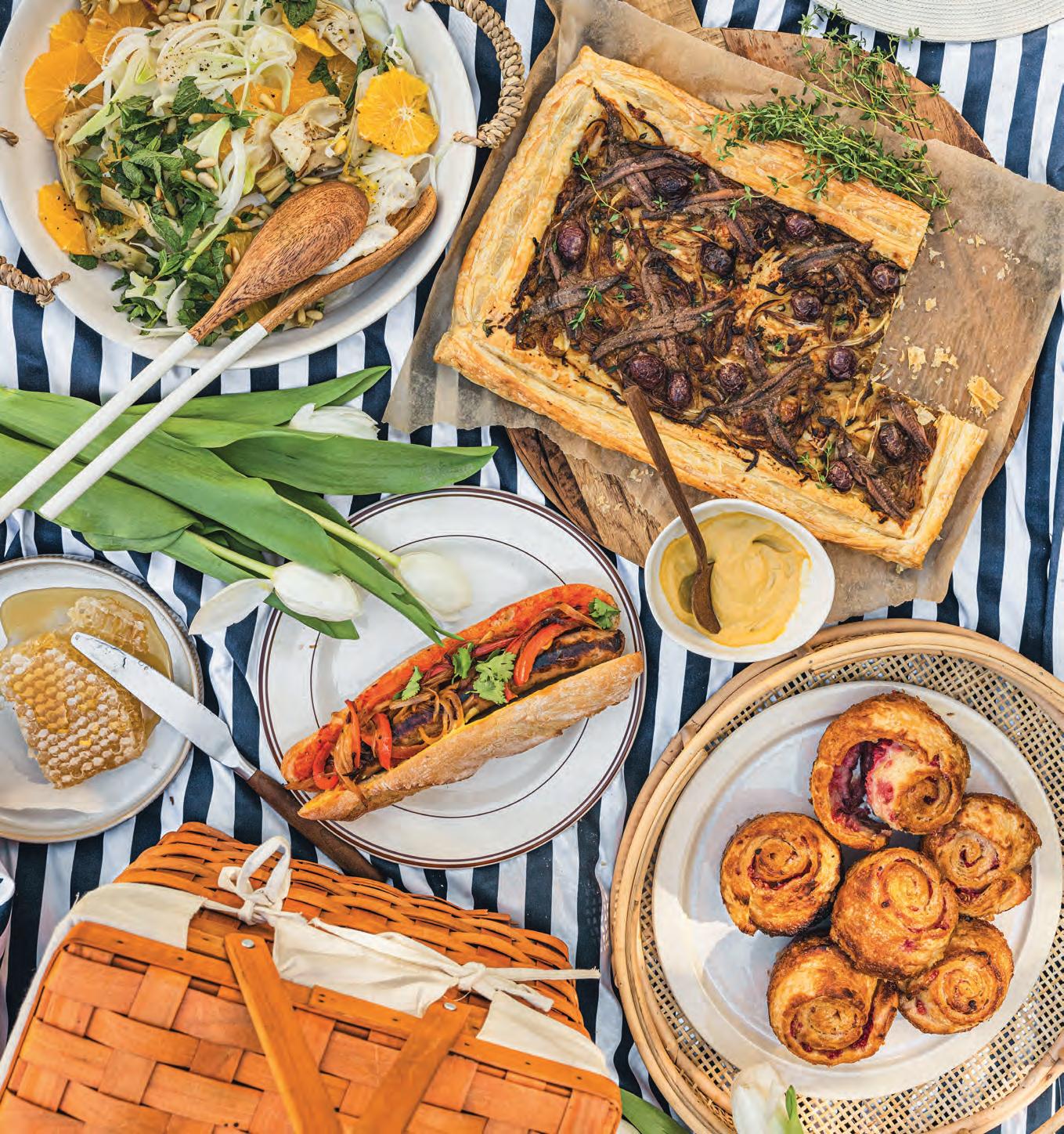 We’ve curated the perfect French spread, which can easily be created indoors (pages 55-61). Enjoy the rustic charm of creamy salmon rillettes, the savoury delight of pissaladière and an assortment of other picnic-perfect items.