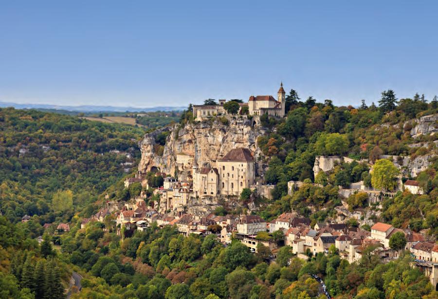 OPPOSITE PAGE, CLOCKWISE FROM TOP LEFT: The picturesque village of Rocamadour sits on a cliff; Cyprian Duroux is a fourthgeneration cheesemaker; Laguiole is a pressed, uncooked cheese that has been made since the 12 th century; Alpine goats at La Borie d’Imbert, a farm renowed for making Rocamadour; Alain Guittard handcrafts Saint-Nectaire cheese; rinds are washed by hand at Mons Cheese; French cheesemaking is often a hands-on process; Plancherin d’Arêches carries notes of buttery caramel, hazelnuts and rich cream with a tangy finish.