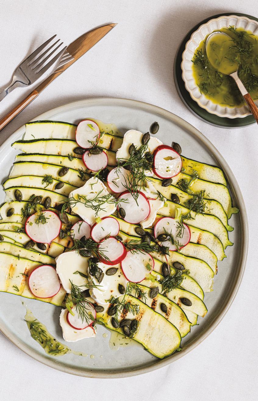Grilled courgette ribbons with pickled radish, goat’s cheese and dill 26