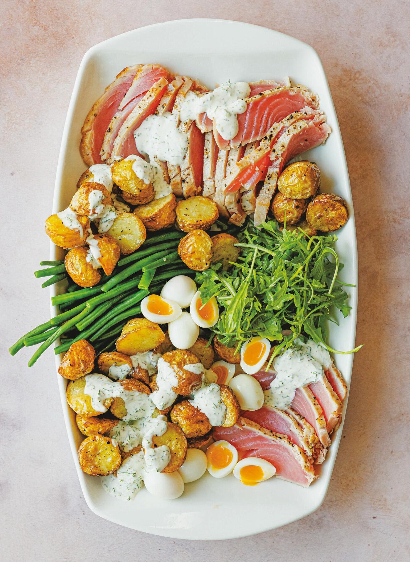 Seared tuna and roasted potato salad with quail eggs 92