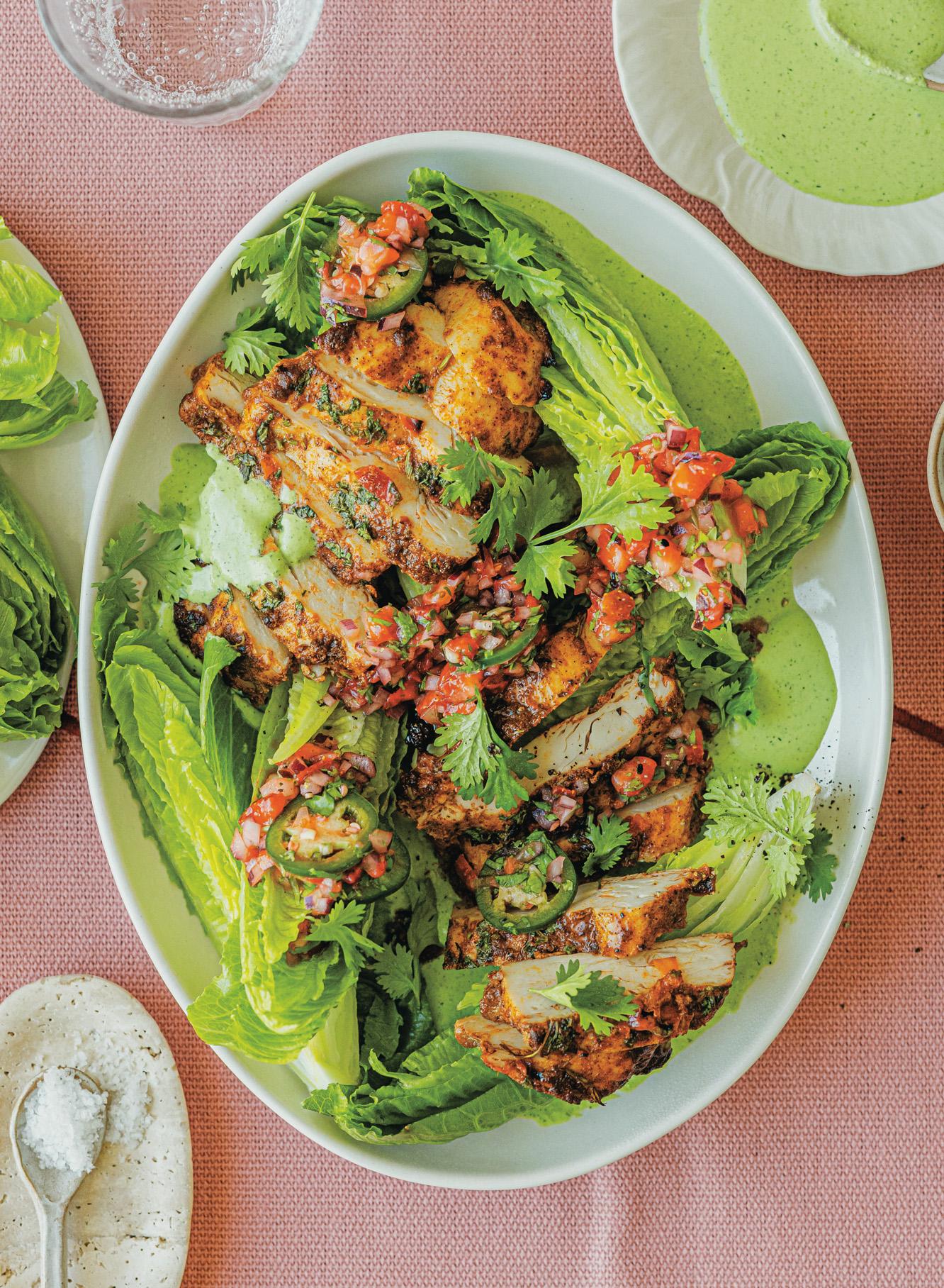 CRUNCHITA LETTUCE WITH STRAWBERRY SALSA, CAJUN CHICKEN AND GREEN GODDESS FETA DRESSING