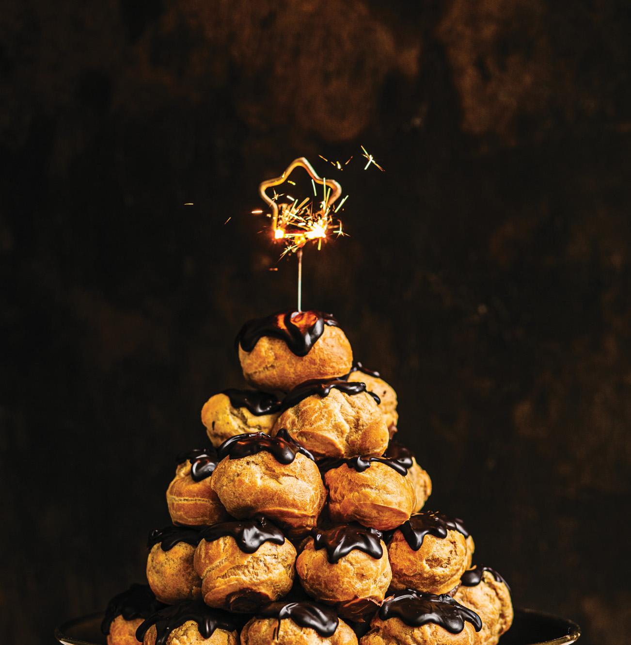 It’s the perfect time of year to indulge in a tower of choux puffs topped with ganache, a mince pie tart with lashings of cream and custard, and our decadent version of bread and butter pudding