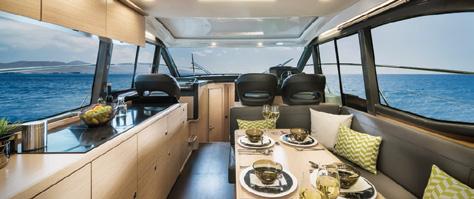 Life on board is easy, enhanced by numerous clever details. Conducive to relaxation, the L-shaped saloon includes an immense integrated storage locker. Intensely bright, the inviting saloon evokes a sense of well-being. Facing sofas and a modular cockpit bench seat, which can pivot to face the saloon, create the perfect space for entertaining.