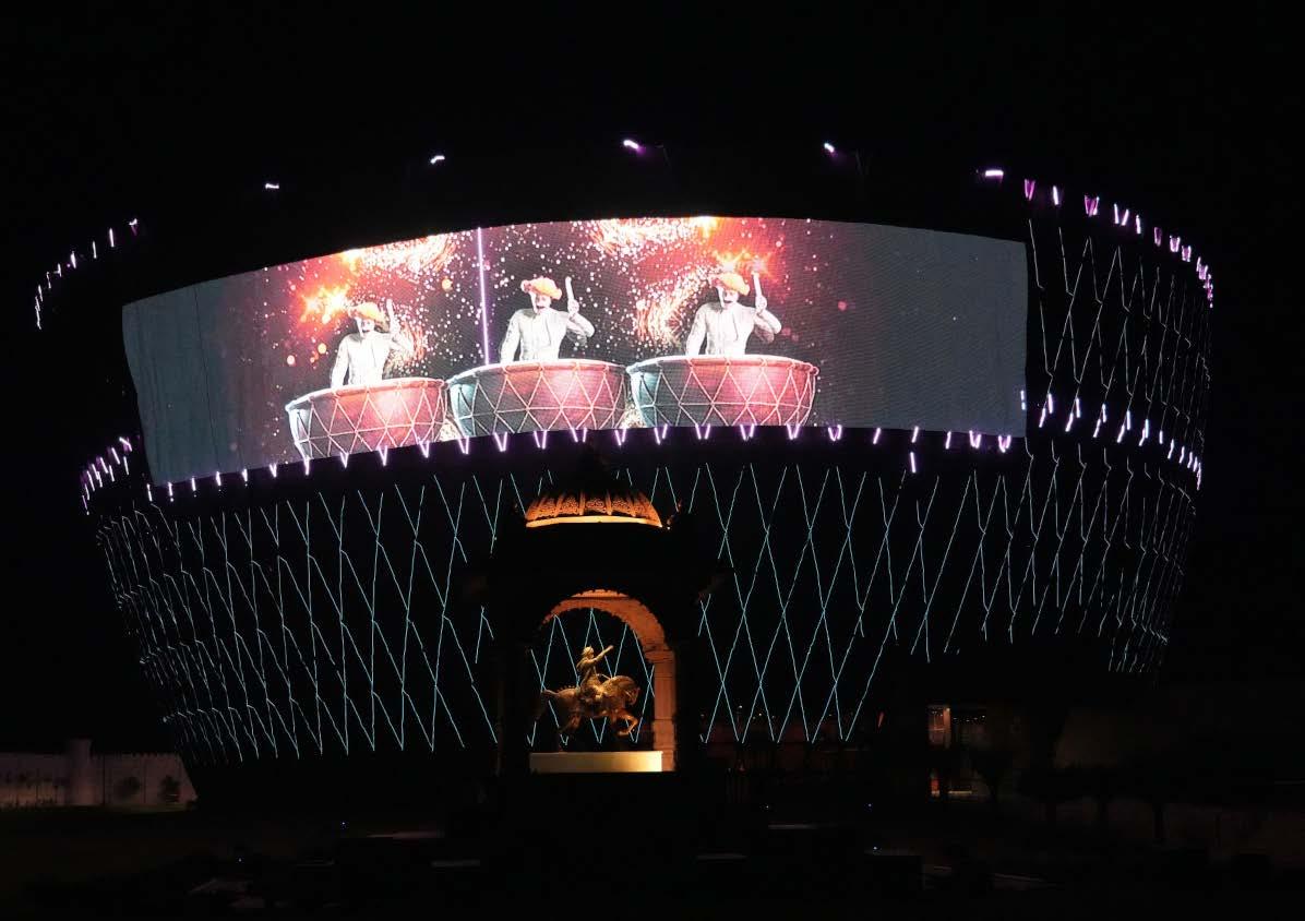 The exterior shell of the building – shaped like a Nagara, or the tribal drum – actually sets the tone for the inner AV experience featuring a light and sound show, with a transparent active LED mesh as the primary display surface. A rectangular surface of MS structure of approx. 1,000 sqm is treated with a P40 pixel-pitch