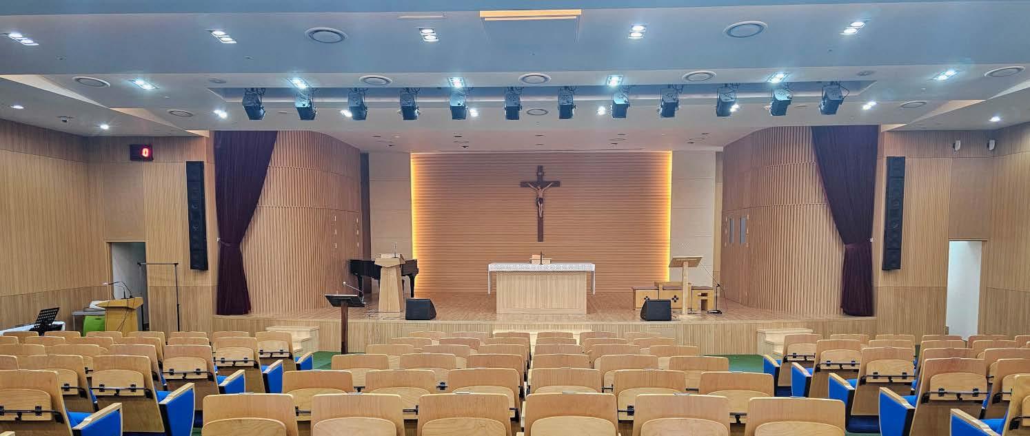 when selecting a new system for the hall. The previous system relied on multiple fullrange loudspeakers distributed throughout the space. In addition to being visually intrusive, both coverage and sound quality left much to be desired, particularly in terms of vocal intelligibility. The clerical staff were keen to resolve these issues and turned to Mr Noh for advice.