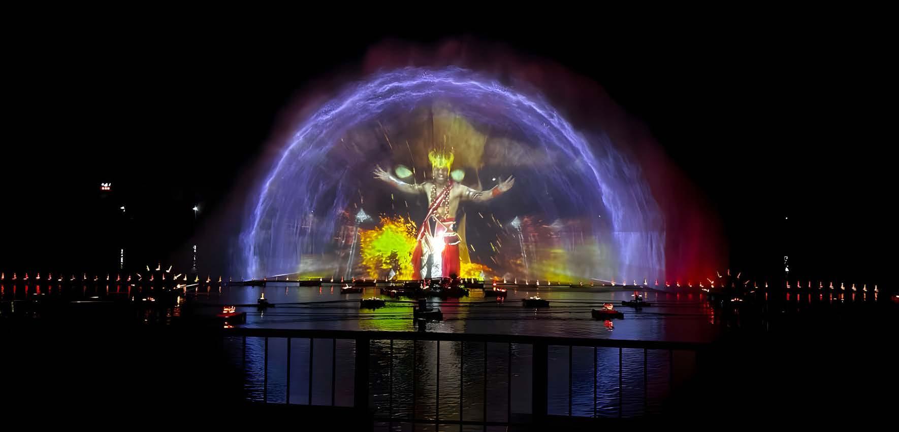 When illuminated with dynamic lighting, these jets of water turn into luminous sculptures, constantly shifting and evolving as the narrative unfolds. The audience experiences a seamless blend of sound, motion and imagery, where fountains dance, light beams sweep across the lake and stories unfold against the night sky.