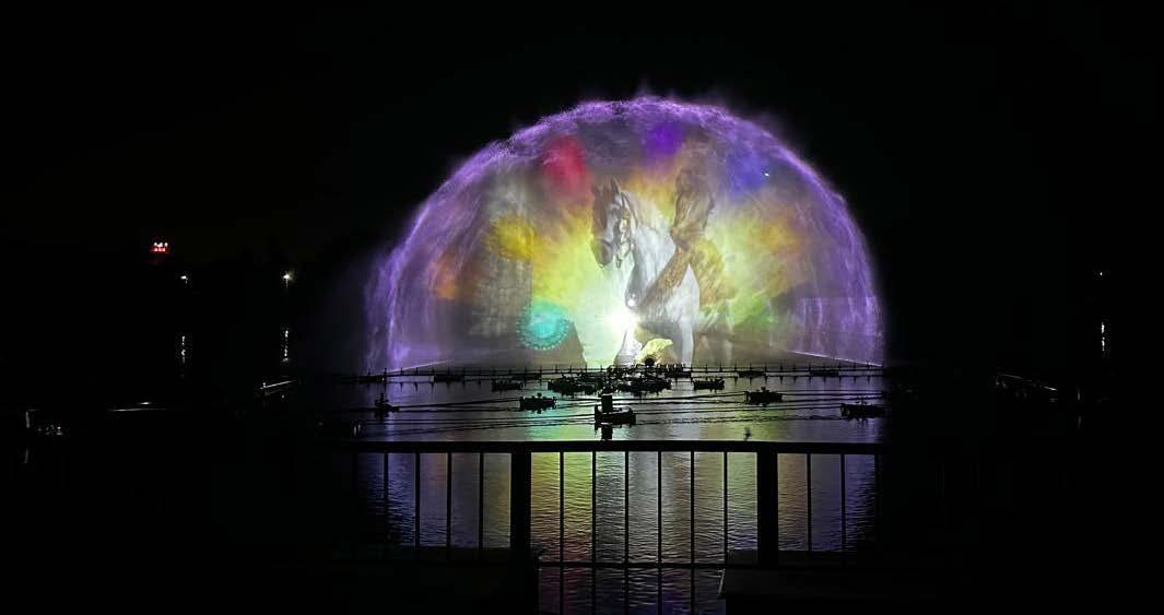 The quintessential aspect of this water projection show lies in transforming water itself into a storytelling canvas. Fine mist is projected upward to form a translucent screen upon which vivid visuals appear, seemingly floating in mid-air.