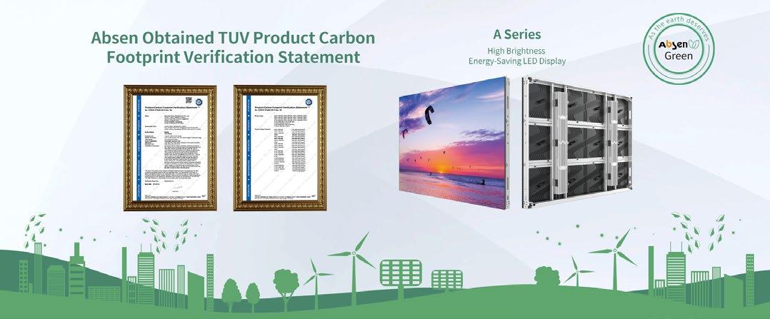 initiatives and sustainability efforts under the ‘Absen Green.’ In November 2022, Absen announced new LED display standards that clearly stated its commitment to solely using sustainable and environmentally friendly materials to manufacture its products. Recently, the Absen A series of LED products have been certified by TÜV SÜD, which is made possible by our specific technological innovations. In the future, we will continue offsetting efforts. And we will continue developing our technology and products with innovation to ensure that we positively impact the Earth.