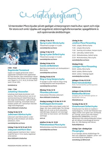 4 Vinterstaden Mora 8 Zornmuseet 10 Morakniv 12 Skidskytten Sara Andersson 13 Alla kan lära sig åka skidor 15 På snö och is 16 Vasaloppet 17 Kransmasen Albin Gezelius 18 Kalendarium 20 Karta Vasaloppets Vintervecka 22 Restaurang- och caféguide 24 Butiker, Made in Mora 26 Sagolandet Tomteland 28 Mora Hotell 30 FM Mattsson Group 34 Mora växer och utvecklas