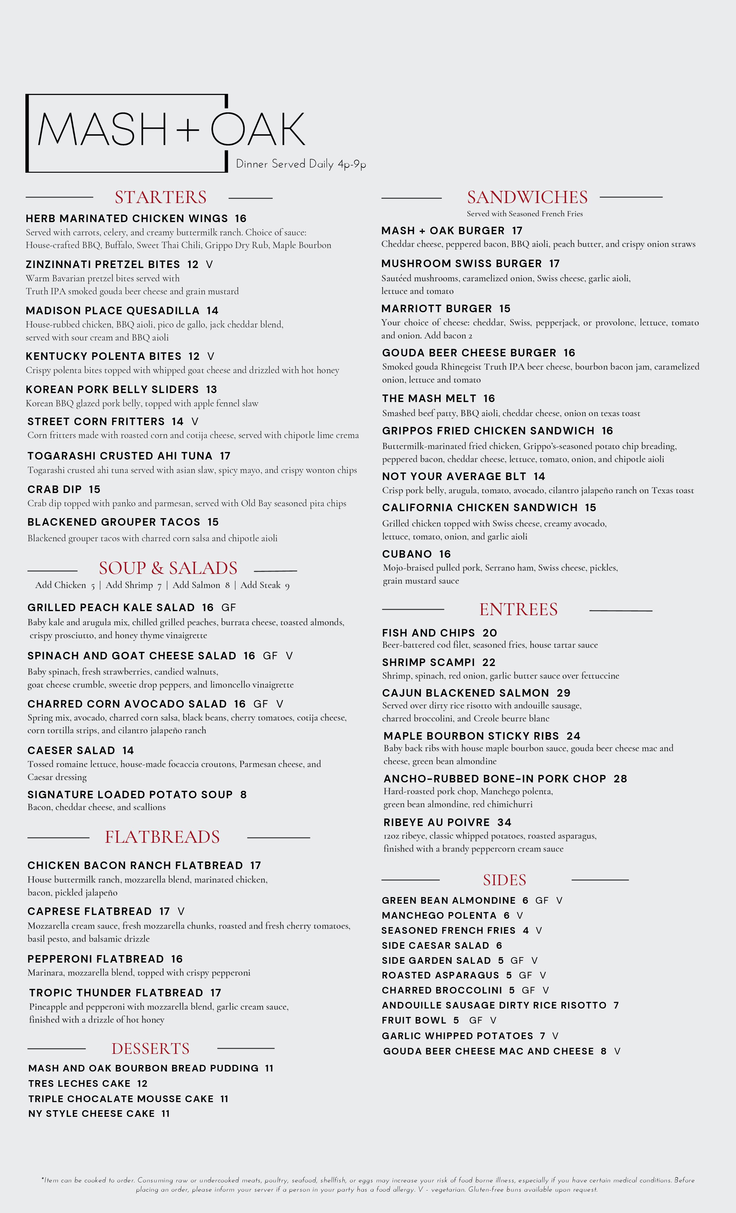 Mash and Oak inside Cincinnati Marriott at RiverCenter Dinner Menu