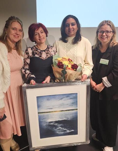Fra venstre: Liv Heidi Siljebråten (juryen), Mariann Varadi og Arunadevi Krishnasamy (Gardermoen Vest Arkivtjeneste) og Anita Haugen Lie (juryen) med prisen bildet «Bølger, blå» av kunstneren Frank Brunner. | Foto: Ingvild Korsnes Daasvand, Lørenskog kommune