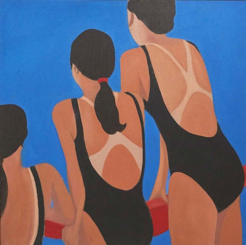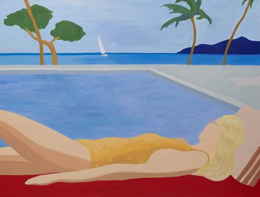 Color is indeed central to this series. Beach scenes and island life are depicted saturated in block color giving the pieces a Wesselman-esque identity. De Haenen uses the centrality of the female body and the advertising aesthetics of Pop Art to express the sensuality of these scenes as relaxed snapshots. They also are a gesture of love for his homeland and a longing for the persistence of the Caribbean identity, its magic, its myths and its history, of which he and his family were the protagonists.