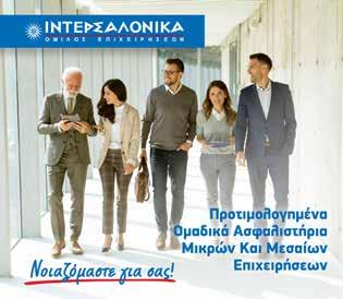 ΑΣΦΑΛΙΣΤΙΚΟ 141 | ΑΠΡΙΛΙΟΣ 2024 | ΕΙΔΗΣΕΙΣ ΕΠΙΚΟΙΝ Ώ Ν ΙΆ ΗΙΝΤΕΡΣΑΛΟΝΙΚΑ επενδύει στα ομαδικά προγράμματα ασφάλισης μικρών και μεσαίων επιχειρήσεων (5 ατόμων και άνω), προσφέροντας ανταγωνιστικά πλεονεκτήματα και εύρος καλύψεων, για κάθε ανάγκη. Παρέχει καλύψεις που συμπληρώνουν το δημόσιο σύστημα υγείας και προσφέρει κεφάλαια αποζημίωσης σε περίπτωση απώλειας ζωής, διαθέτοντας παράλληλα μια σειρά ανταγωνιστικών πλεονεκτημάτων: • Οι ασφαλισμένοι έχουν δικαίωμα να χρησιμοποιήσουν οποιοδήποτε δημόσιο ή ιδιωτικό νοσηλευτικό ίδρυμα ή διαγνωστικό κέντρο της επιλογής τους. • Το ποσοστό κάλυψης των εξόδων αφορά το 100%, ανεξαρτήτως ποσοστού συμμετοχής του δημόσιου ταμείου. • Καλύπτονται η εξωνοσοκομειακή περίθαλψη και οι ιατρικές επισκέψεις σε οποιονδήποτε ιατρό επιλέξει ο ασφαλισμένος με απόδοση 100% επί των αποδείξεων. • Δίνεται η δυνατότητα κάλυψης και των μελών των οικογενειών των ασφαλισμένων, καλύπτοντας τα παιδιά τους ως προστατευόμενα μέλη μέχρι την ηλικία των 25 ετών, χωρίς απαραίτητα να σπουδάζουν σε κάποια αναγνωρισμένη σχολή. • Με μηδενικές απαλλαγές στις αποζημιώσεις. ΠΡ Ο ΓΡΆ ΜΜ Ά Ά ΣΦΆΛΙΣΗΣ «ΦΙΛΟΞΕΝΙ Ά» Και στον κλάδο της φιλοξενίας δραστηριοποιείται δυναμικά η ΙΝΤΕΡΣΑΛΟΝΙΚΑ, έχοντας αναπτύξει ολοκληρωμένα ασφαλιστικά προγράμματα για να καλύψει τις ανάγκες των επιχειρήσεων του κλάδου. Συγκεκριμένα, το πρόγραμμα ασφάλισης «ΦΙΛΟΞΕΝΙΑ» είναι ειδικά σχεδιασμένο για ξενοδοχειακές μονάδες και τουριστικά καταλύματα, συνδυάζοντας την εμπειρία της ΙΝΤΕΡΣΑΛΟΝΙΚΑ στο χώρο της ασφάλισης και την κατανόηση των μοναδικών αναγκών κάθε επιχείρησης. Το πρόγραμμα «ΦΙΛΟΞΕΝΙΑ» περιλαμβάνει μια ευρεία γκάμα καλύψεων, όπως κάλυψη από καθίζηση ή κατολίσθηση ως συνέπεια σεισμού, καιρικά φαινόμενα, φυσικές καταστροφές, σεισμό, αλλοίωση εμπορευμάτων, αξία αντικατάστασης καινούργιου, αστική ευθύνη με δύο εναλλακτικές επιλογές ορίων κάλυψης κ.ά. Ά ΣΦΆΛΙΣΗ ΘΆ ΛΆΣΣΙ Ώ Ν ΣΚ ΆΦΏΝ Ολοκληρωμένα προγράμματα ασφάλισης θαλάσσιων σκαφών προσφέρει η ΙΝΤΕΡΣΑΛΟΝΙΚΑ, δίνοντας τη δυνατότητα για ανέμελα ταξίδια και στη θάλασσα. Μέσα από τα προγράμματα ασφάλισης, οι ενδιαφερόμενοι έχουν τη δυνατότητα, εκτός από την υποχρεωτική Αστική Ευθύνη, να ασφαλίσουν το σκάφος τους και έναντι πολλαπλών κινδύνων όπως: Προσάραξη - ΣύγκρουσηΒύθιση - Ημιβύθιση , Πυρκαγιά, Κλοπή σκάφους από πειρατεία, Κλοπή σκάφους, λέμβων ή της εξωλέμβιας μηχανής και Κακόβουλες πράξεις. Τρία νέα προγράμματα στην αγορά ΟΜ Ά ΔΙΚΆ ΜΙΚΡΏΝ Κ Ά Ι ΜΕΣ ΆΙΏ Ν ΕΠΙΧΕΙΡ Η ΣΕ Ώ Ν