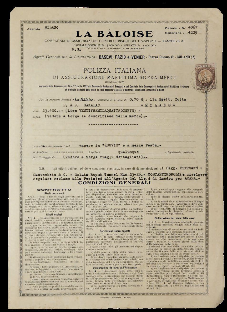 LA BALOISE – Transport safety contract for various ports of the Mediterranean, of the trader of Constantinople, P. Sakalak, 1923-1925 (Baloise is one of the main shareholders of the ATLANTIC UNION)