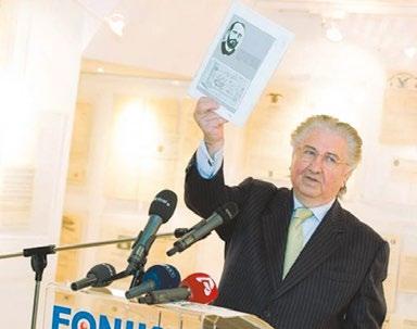 The publisher Mr. Evangelos Spyrou, holding in his hand the policy of Eleftherios Venizelos' life insurance, during the exhibition "Insurance Contracts with History and Artistic Value", held at the Art Hall "STOArt KORAI" of ETHNIKI Insurance, on November 11, 2015.