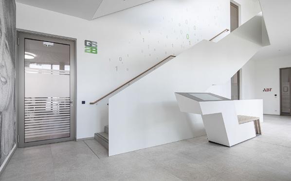 Mit Stahl konnten filigrane wie elegante Strukturen realisiert werden. Dies mit einer Klarheit und Leichtigkeit, die mit Holz oder Beton nicht machbar ist. Schon gar nicht über 7 Stockwerke, mit durchgehend nur 1,5 cm Wandstärke. Genau diese zarte Eleganz, ganz in Weiß, verleiht dem GS28 Entrée heute sein WOW. Dabei versteht es das ausdrucksstarke Treppenwerk in kunstvoller Ästhetik den Geist des Gebäudes zu unterstreichen: Innovation durch Wissenschaft und Wirtschaft. Innovativ ist die Treppe mit diesem unglaublichen Treppenauge und dem hauchzarten Geländer in jedem Fall. Und irgendwie auch eine Wissenschaft für sich.