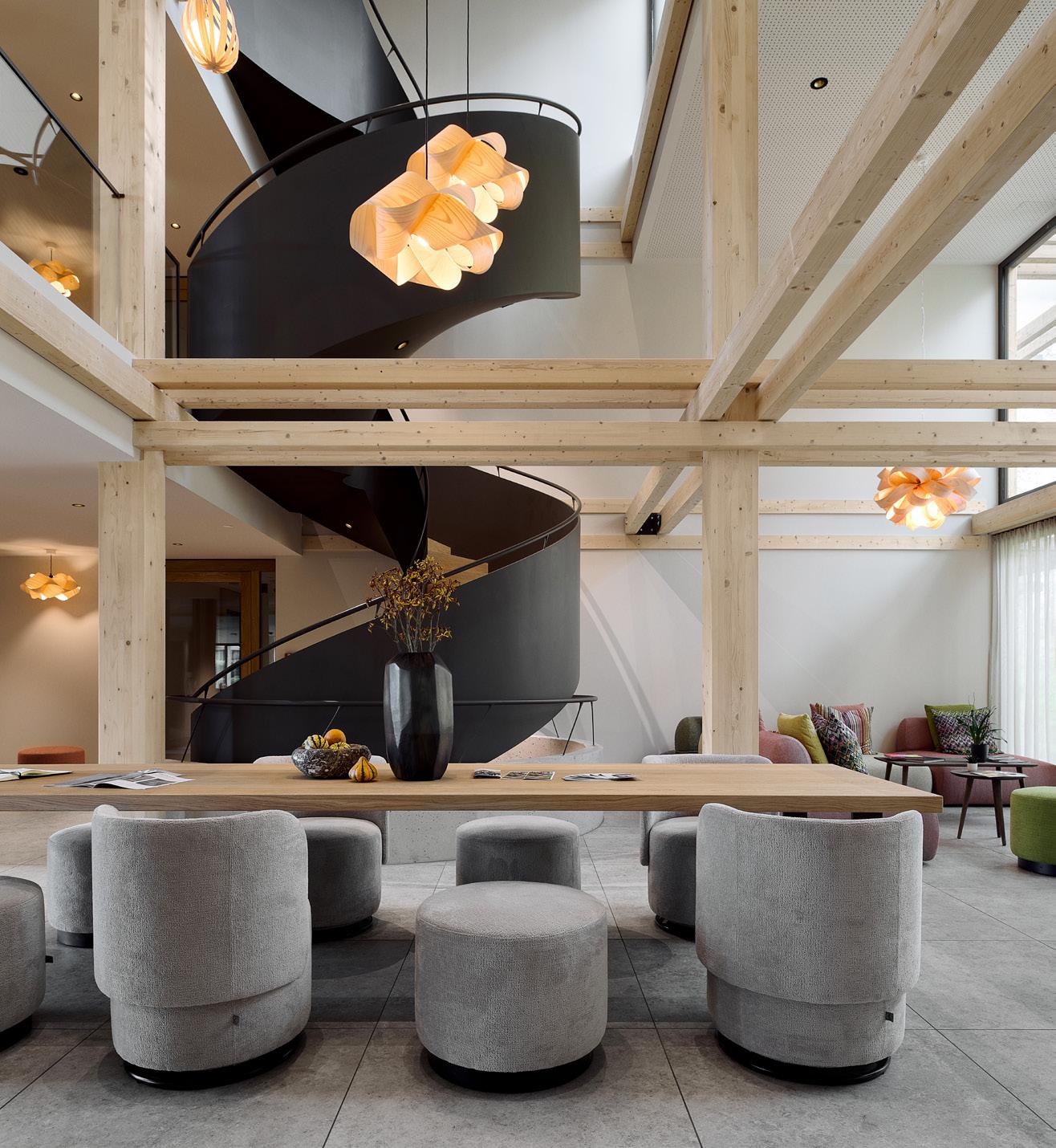Der Antritt der Treppe in der Lobby gibt den Blick frei auf den Tölzer Wald. Einige Stufen höher: freie Sicht, Blick auf die Berge. „Dieses Wechselspiel zwischen Wald und Bergen ermöglicht ein Verschmelzen mit dem Ort im Hier und Jetzt“, so der ausführende Architekt Sebastian Beham. Achtsamkeit passiert auf dieser Treppe quasi en passant, durch das Begehen nach oben Richtung RoofTop Bar und nach unten in die Lobby. Hier steht die Treppe aus massivem Stahl. Leichtfüßig, einladend – und mit ihren rund gebogenen, geländerhohen Wangen in kontrastierender Harmonie zu dem offenen Raumgefüge.
