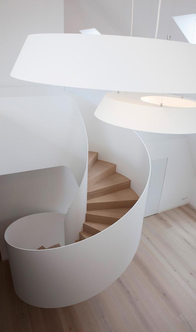 Steel allowed us to create delicate, majestic structures with a clarity and weightlessness that is impossible with wood or concrete. Certainly not over 7 floors, when the panels are never more than 1.5 cm thick. This graceful elegance, a vision in white, is what gives the GS28 entrance its WOW factor today. With its aesthetic appeal, the expressive staircase underlines the spirit of the building: innovation through science and industry. The spectacular stairwell and the ultrafine balustrade are truly innovative. And in some ways also highly complex.
