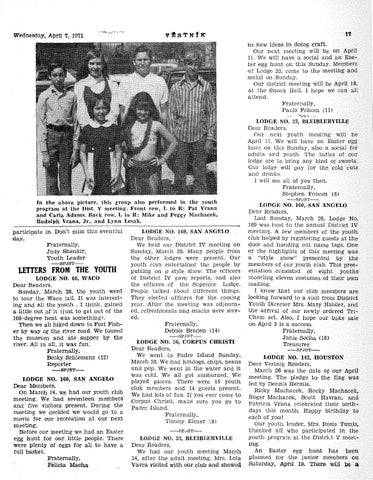 LODGE NO. 56, CORPUS CHRISTI Dear Readers, We went to Padre Island Sunday, March 28. We had hotdogs, chips, beans and pop. We went in the water and it was cold. We all got sunburned. We played games. There were 16 youth club members and 14 guests present. We had lots of fun. If you ever come to Corpus Christi, make sure you go to Padre Island. Fraternally, Timmy Elsner `,.8) —SP.) ST— LODGE NO. 33, BLEIBLERVILLE Dear Readers, We had, our youth meeting March 14, after the adult meeting. Mrs. Lola, Vavra visited with our club and showed