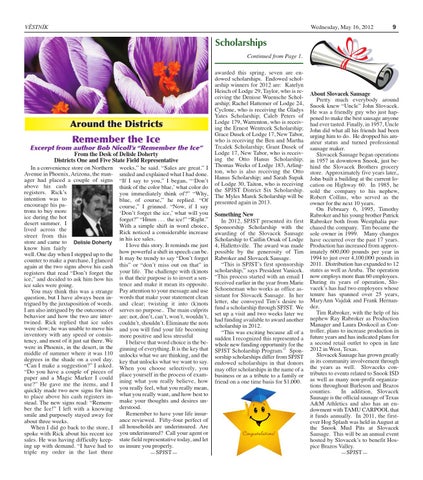 Something New In 2012, SPJST presented its first Sponsorship Scholarship with the awarding of the Slovacek Sausage Scholarship to Caitlin Orsak of Lodge 4, Hallettsville. The award was made possible by the generosity of Tim Rabroker and Slovacek Sausage. “This is SPJST’s first sponsorship scholarship,” says President Vanicek. “This process started with an email I received earlier in the year from Marie Schoeneman who works as office assistant for Slovacek Sausage. In her letter, she conveyed Tim’s desire to fund a scholarship through SPJST. We set up a visit and two weeks later we had funding available to award another scholarship in 2012. “This was exciting because all of a sudden I recognized this represented a whole new funding opportunity for the SPJST Scholarship Program.” Sponsorship scholarships differ from SPJST endowed scholarships in that donors may offer scholarships in the name of a business or as a tribute to a family or friend on a one time basis for $1,000.