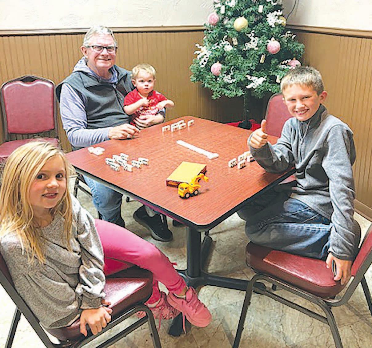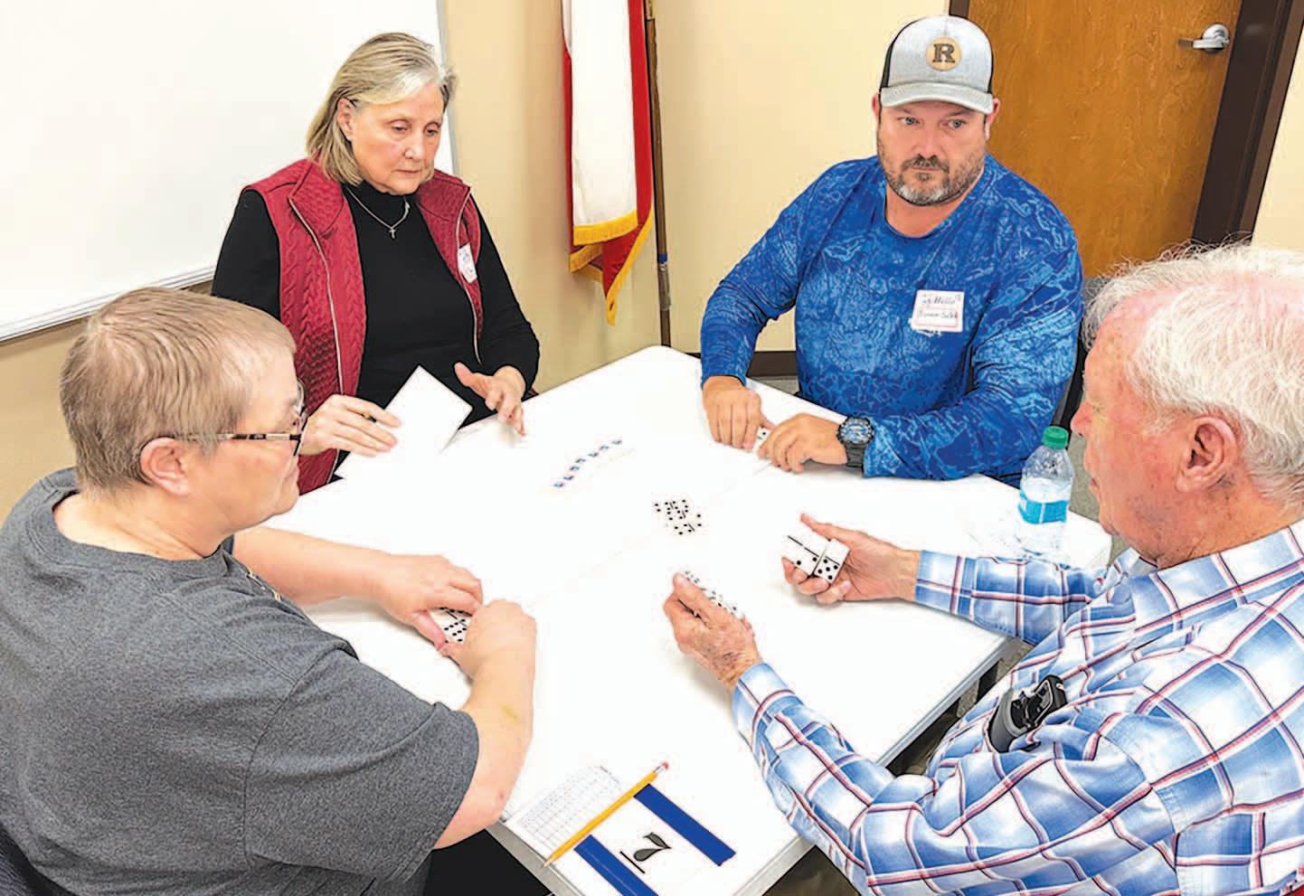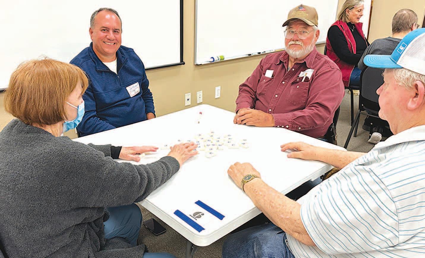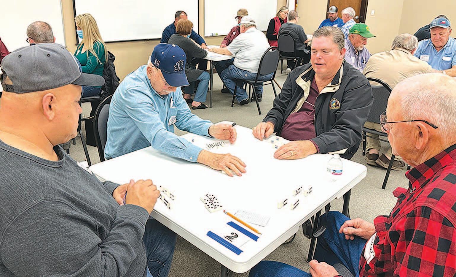 Scooter Holland teaches youth at Lodge 25, Ennis how to play dominoes.