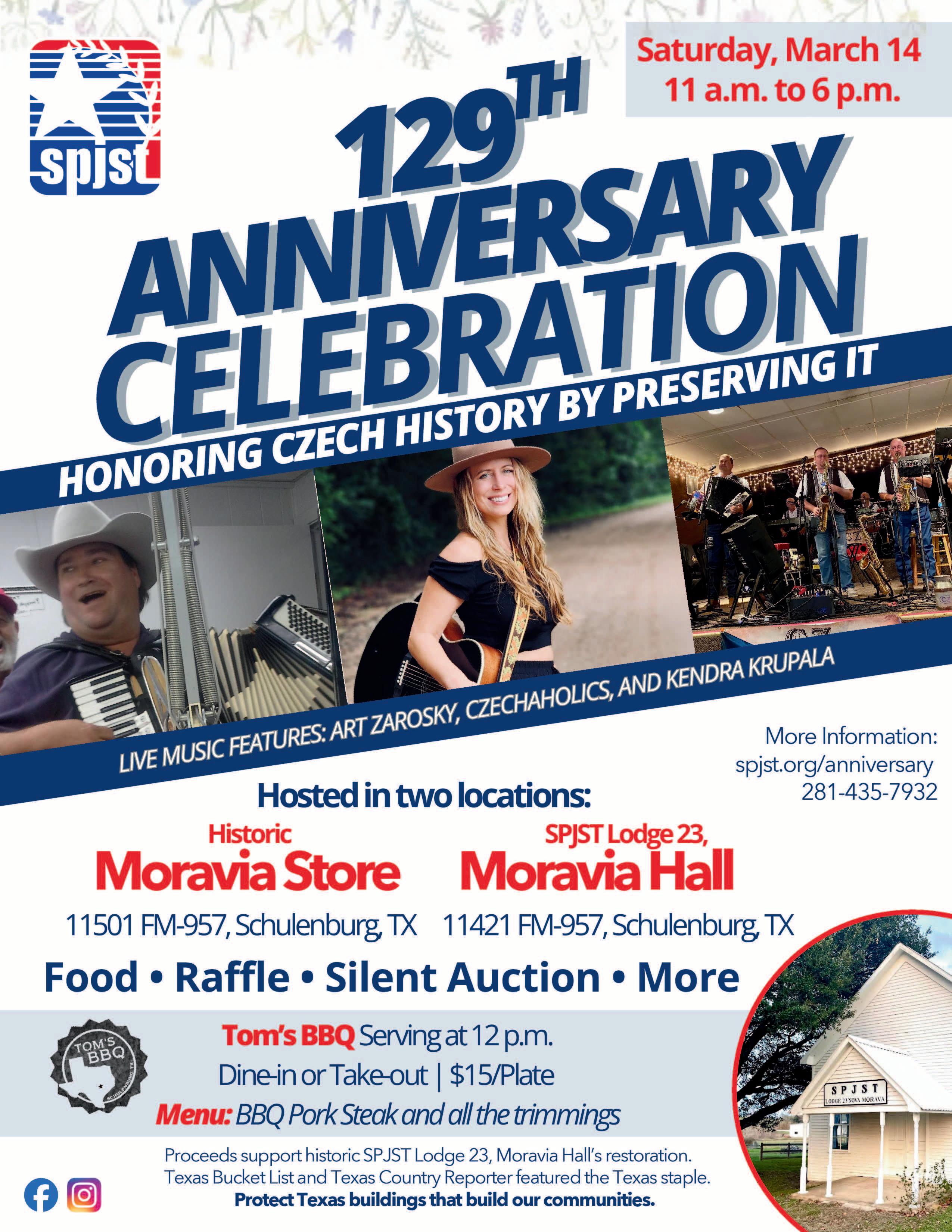 n Saturday, March 14, 2026, SPJST Lodge 23, Moravia hosts SPJST’s 129th Anniversary Celebration at two beloved landmarks – SPJST Lodge 23, Moravia Hall and Moravia Store. Festivities kick off at 11 a.m., with dine-in or take-out plates by Tom’s BBQ of Schulenburg, followed by a short program at 1 p.m. and live music by The Czechaholics at Moravia Store from 2 to 6 p.m. The lodge hall will showcase on-loan artifacts from the Czech Heritage Museum and Genealogy Center of Temple for the event. While viewing these pieces, attendees can enjoy country music by Kendra Krupala and accordion music by Art Zarosky. A 23-prize raffle, silent auction, and games will round out the event. Proceeds will support the restoration of the Lodge 23 hall—ensuring it remains a living, welcoming space for present and future generations.