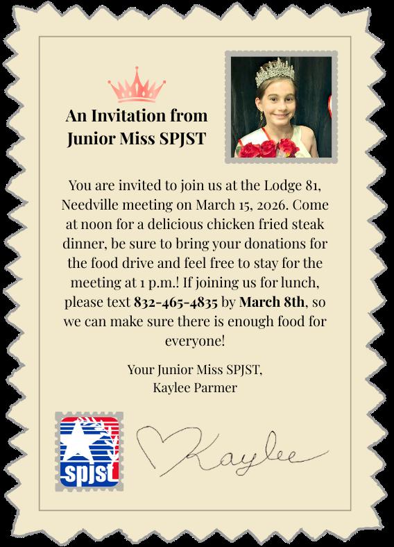 Lodge Meetings: Held quarterly - the second Sunday in March, June, September, and December at 1 p.m. at Mikeska’s BBQ (off Highway 59), El Campo 77437. For information, contact President Linda Henderson 281-8045251; email hendersonlj@hotmail.com; Vice President/Reporter Ardis Bacak 832-247-6350;