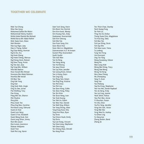 Teo Thian Chye, Stanley Teoh Seang Fong Ter Poh Lin Thng Yan Qi, Dollyn Thong Swee Chin, Magdalene Tio Hua Eng, Sally Toh Bee Yen Toh Lye Ching, Doris Toh Say Min Toh Siew Luan, Trena Tu Junfeng Tung Yan Hong Umi Kurniyati Ung Tze Yang Wang Guoqiang, Edison Wang Pei Wee Liang Wah Wong Mei Ching, Tracy Wong See Meng Wong Yat Kong Woo Siew Cheng Wu Zhenqiang Yang Yi, Even Yang Yue Yao Peiliang Yap Rui Fang, Stephanie Yee Yon Wei, Daniel Raphael Yeo Jia Seng, Andy Yeo Lei Ling, Joanne Yeoh Simin, Felicia Yew Part Mui, Annie Yi Shuzhen, Susan Yin Shu Zhen Yip Pui Yeng, Jennifer Yong Kim San, Victor Yong Mei Wai Yong Wee En, Audrey Yu Chew Ling Yu Seng Lee Zhang Jianbin, Bend Zheng Jie