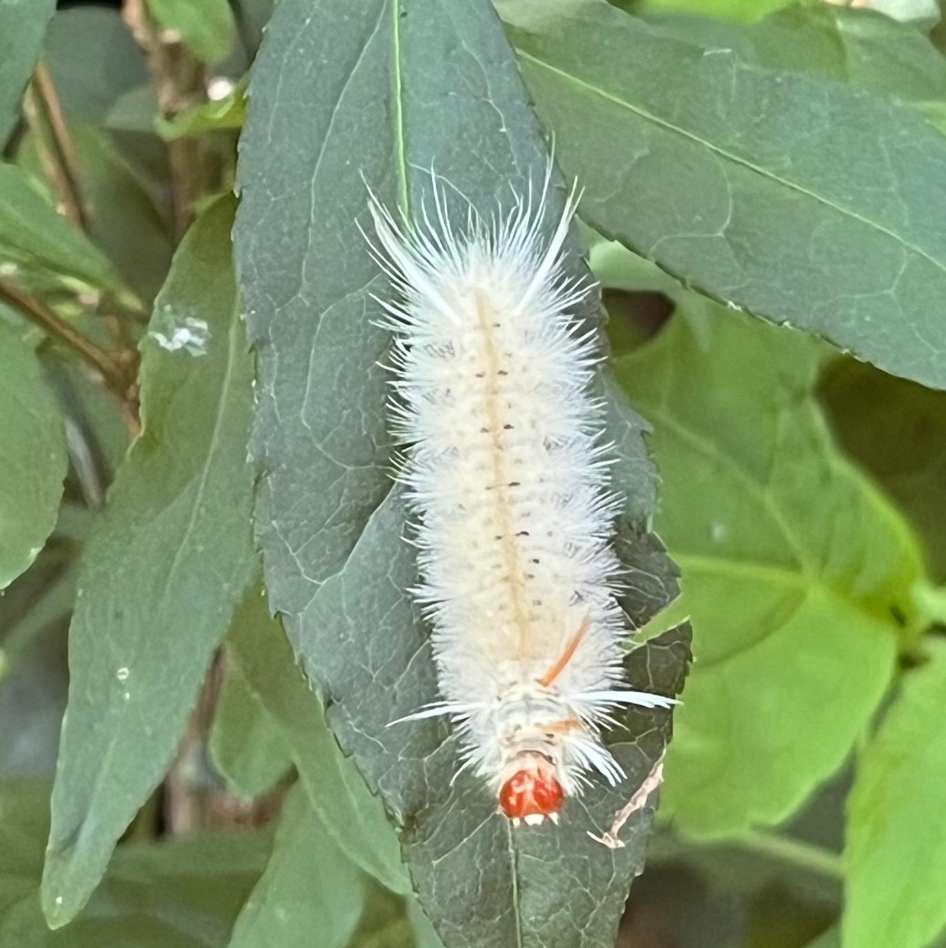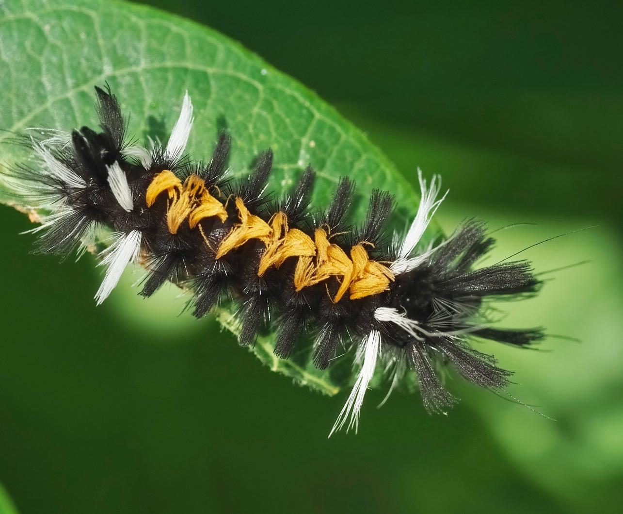 Sycamore tussock moth caterpillar (right one infected with parasitic wasps)