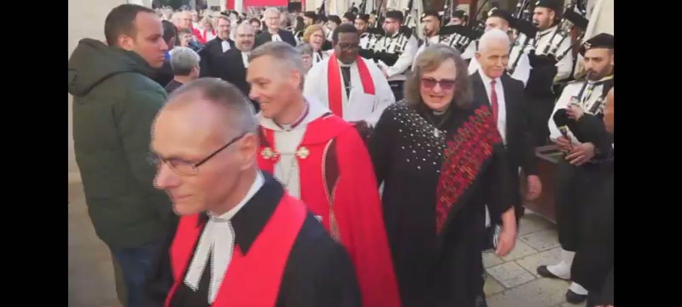 ordination of the first Palestinian woman to a Palestinian church with a determined Rev Nichola striding along talking to the Canadian Bishop in the red cape and being almost deafened by the Scout band who played ‘Jingle bells’ at this highly emotional moment! It was a stunning ordination for Revd Sally Azar where the majority of clergy were women : it’s doubtful that such a gathering has happened like this ever before.