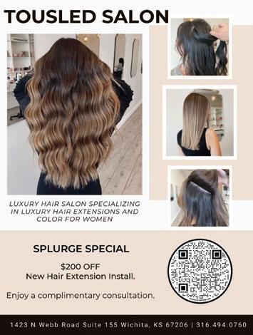 ©2022 Sierra Pacific Mortgage Company, Inc , NMLS # 1788 Equal Housing Lender (www nmlsconsumeraccess org) Mortgage Lender License 06 16329 1180 Iron Point Road, Suite 200, Folsom, CA 95630 (Tel 800 447 3386) Sierra Pacific Mortgage is not acting on behalf of or at the direction of FHA/HUD/VA or the federal government For licensing information, go to: www nmlsconumeraccess org Sierra Pacific Mortgage may not be the lender for all products offered Some loans may be made by a lender with whom Sierra Pacific Mortgage has a business relationship O 316 260 5656 10111 E 21st St North, Suite 200 Wichita, KS 67206 NMLS# 1788 KITCHEN TUNE-UP CAN WORK MAGIC IN YOUR KITCHEN, TOO MANY REMODELS COMPLETED IN ONLY 1-5 DAYS! Refacing • Cabinet Painting • Redooring • Custom Cabinets 1 Day Tune-Up • Countertops and Backsplash • And More Options beginning as low as $99 - $249 a month! 316.558.8888 | kitchentuneup.com FOLLOW US ON FACEBOOK BEFORE 85 DECEMBER 2022 · splurgemag.com