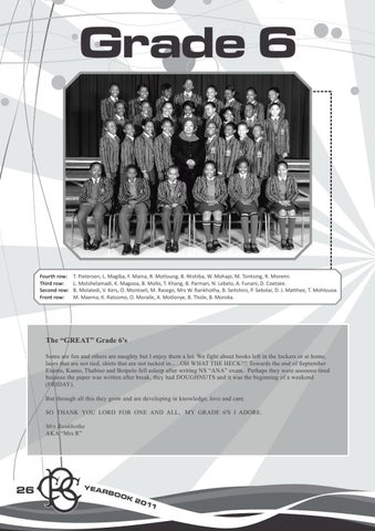 The “GREAT” Grade 6's Some are fun and others are naughty but I enjoy them a lot. We fight about books left in the lockers or at home, laces that are not tied, shirts that are not tucked in......OH WHAT THE HECK!!! Towards the end of September Exams, Kamo, Thabiso and Boipelo fell asleep after writing NS “ANA” exam. Perhaps they were soooooo tired because the paper was written after break, they had DOUGHNUTS and it was the beginning of a weekend (FRIDAY). But through all this they grow and are developing in knowledge, love and care. SO THANK YOU LORD FOR ONE AND ALL, MY GRADE 6'S I ADORE. Mrs Rankhotha AKA “Mrs R”