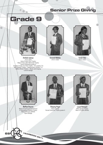 1st in class Hans Frolich Dux Trophy Major Fred Lotter Memorial Trophy Good Fellowship grade 9 Doretta Cronje van Wyk Trophy – AC grades 7-9 ME Doherty Trophy – Mathematics grades 7-9 Saffy’s Music Trophy – Music and singing Culture Badge