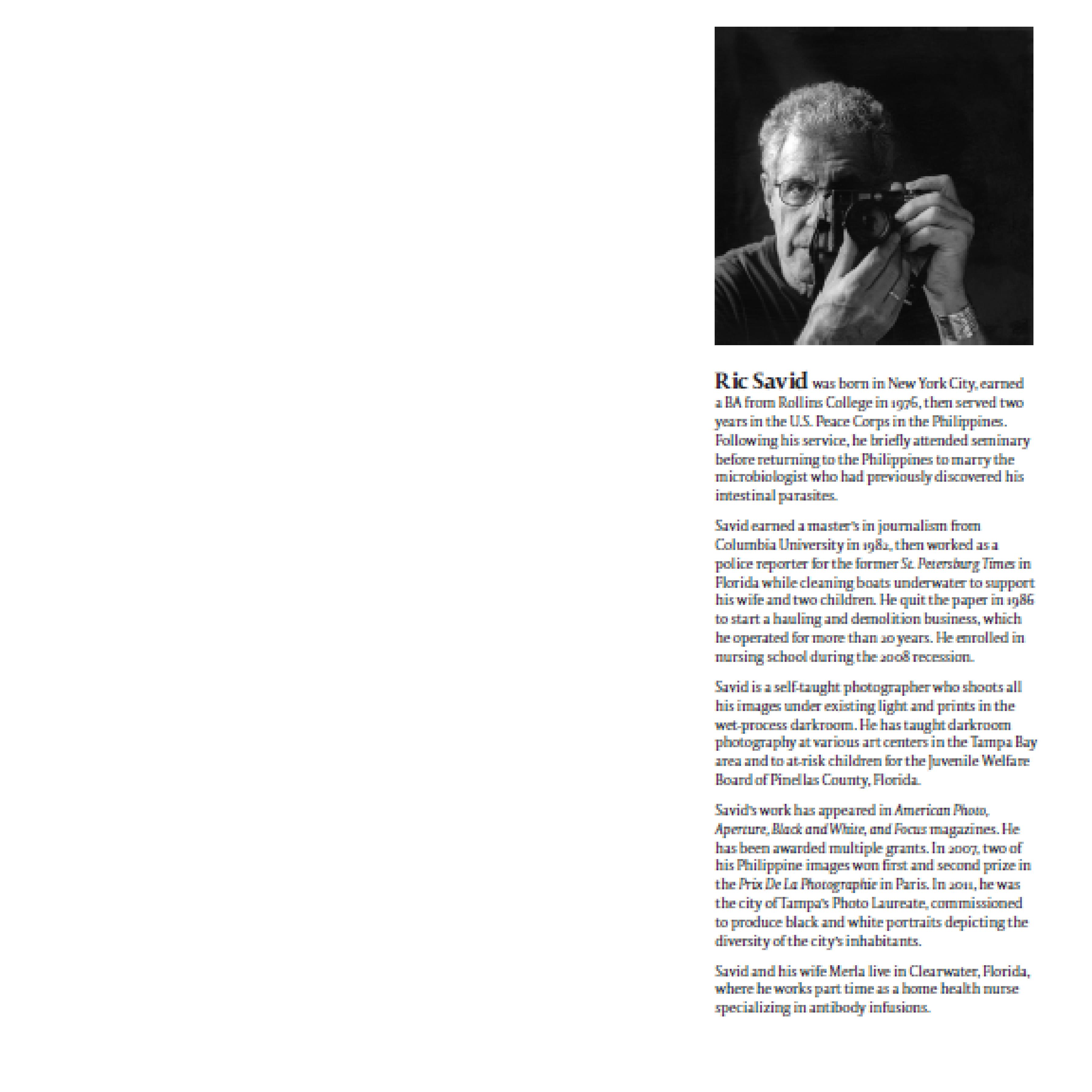 Ric Savid was born in New York City, earned a BA from Rollins College in 1976, then served two years in the U.S. Peace Corps in the Philippines. Savid earned a master’s in journalism from Columbia University in 1982, then worked as a police reporter for the former St. Petersburg Times in Florida. Savid is a self-taught photographer who shoots all his images under existing light and prints in the wet-process darkroom. He has taught darkroom photography at various art centers in the Tampa Bay area and to at-risk children for the Juvenile Welfare Board of Pinellas County, Florida. Savid’s work has appeared in American Photo, Aperture, Black and White, and Focus magazines. He has been awarded multiple grants. In 2007, two images won first and second prize in the Prix De La Photographie in Paris. In 2011, he was the city of Tampa’s Photo Laureate. Savid and his wife Merla live in Clearwater, Florida, where he works part time as a home health nurse. In 2024 he was named the second SPMOP Photo Laureate.