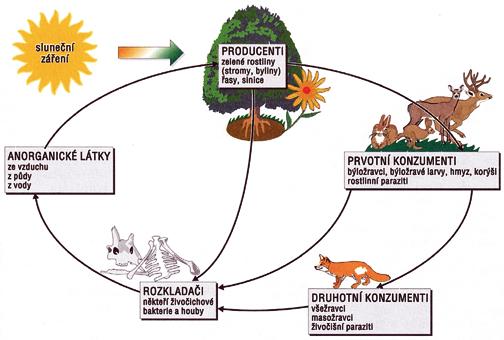 Rostliny jsou potravou dalších organism a za íná takzvaný potravní et zec, jedna z nejsiln jších vazeb v ekosystému Potravní et zec umožuje, aby všechny živé organismy využívaly slune ní energii. Býložravci, jako jsou králíci, srnci, jeleni, pojídají rostliny. Protože býložravci se sami stávají potravou živo ich na vyšší úrovni potravního et zce, dá se íci, že p enášejí energii z íše rostlin do sv ta zví at. Masožraví živo ichové, k nimž pat í nap íklad lišky, požírají býložravce. Nejvyšší skupinou jsou všežravci, jako nap íklad medv d brtník, jimž jako potrava slouží rostliny i živo ichové. Když rostliny a živo ichové uhynou, jejich t la (biomasu) rozloží mikroorganismy (bakterie nebo houby) a uvolní živiny. Tyto živiny se vrátí zpátky do p dy a putují k rostlinám. Jsme zase na po átku potravního et zce, spojujícího jednotlivé složky ekosystému v jeden celek.