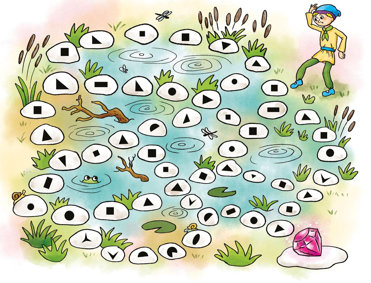 Skřítek chce najít cestu přes bažinu k drahokamu. Může vstoupit jen na kameny, kde je trojúhelník nebo čtverec. Přeskočit ani vynechat kámen nesmí!