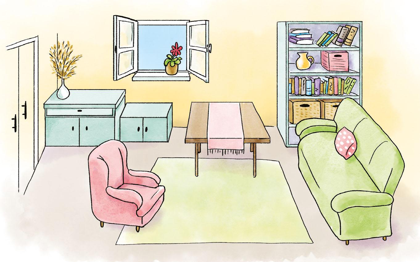 Do bytu DOKRESLI vázu na stůl, míč za křeslo, koš na odpadky vedle stolu, malý stolek mezi křeslo a pohovku. DOPLŇ, kam chceš, televizi nebo obraz.