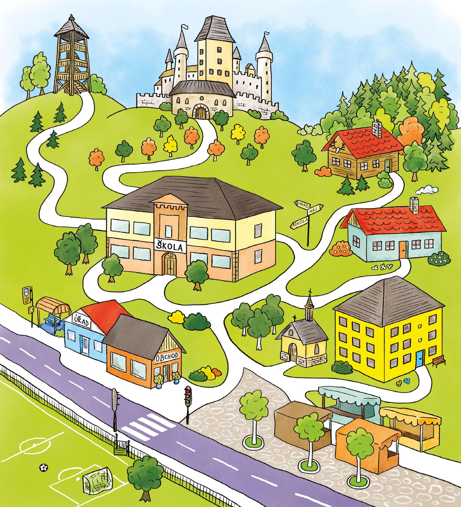 Bydlíš v domku pod lesem, ale ne v myslivně. Zakr esli, kudy jdeš z domova do školy. KOLIK oken vidíš v přízemí školy? Ze školy jdeš nejkratší cestou na fotbalové hřiště. Cestu vyznač a popiš, kudy vede. Pak jdeš nakoupit. Řekni, co cestou vidíš a KOLIK toho je. Nový pan učitel bydlí nedaleko kapličky. Kudy chodí do školy on? Vyb er si dům, kde bydlí tvůj kamarád. Kudy chodí na autobus? Kam asi jede? Turisté jdou od autobusu na trh a pak chtějí na hrad. Poraď jim.