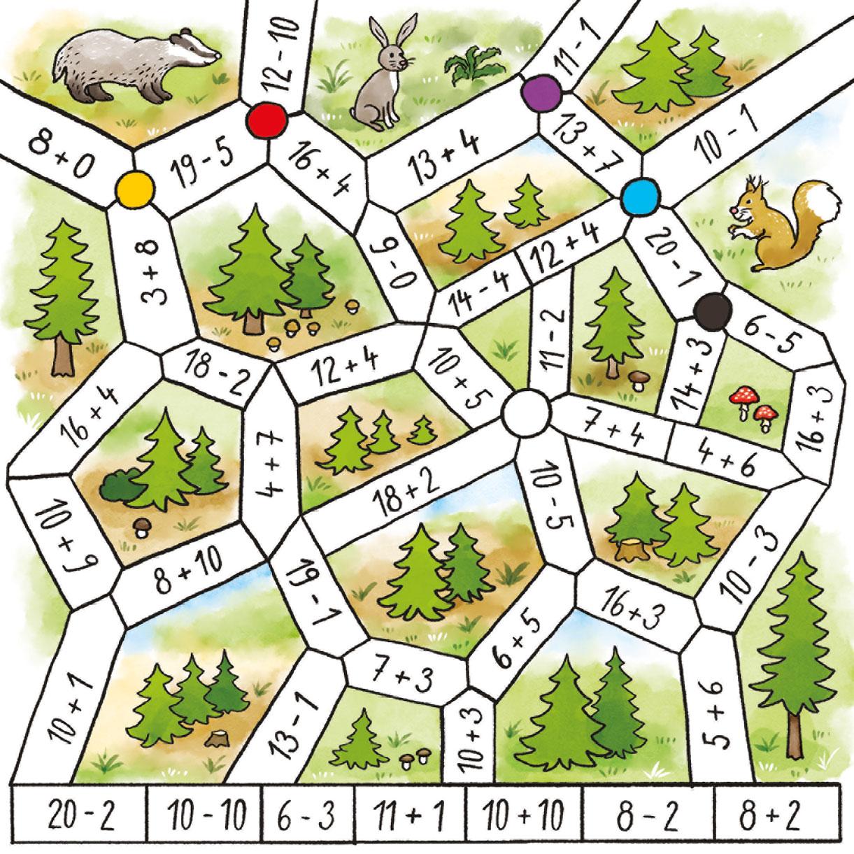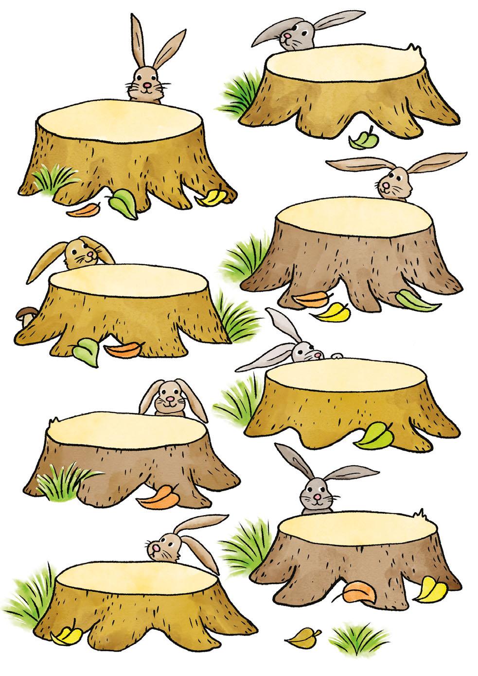 Každý zajíc má své místo u pařezu jako děti ve školní lavici. Na pařezech jsou vždy 2 úlohy. Hned po výpočtu úloh na každém pařezu se vždy podívej do klíče a vybarvi oba výsledky stejnou barvou, jakou mají úlohy na pařezu. Zjistíš tak jméno a příjmení zajíce.