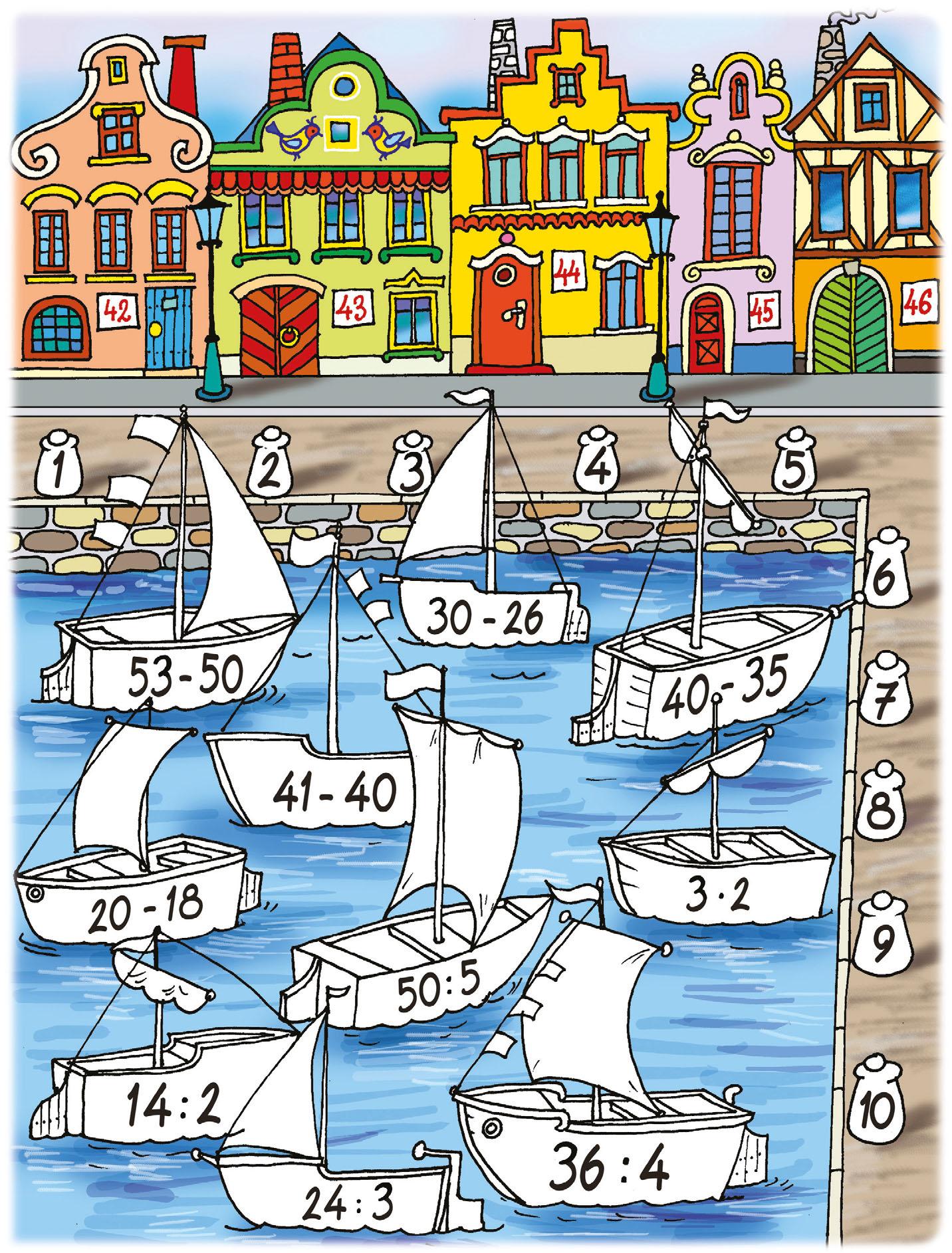 Pokud objevíš na některé straně učebnice loďku, vyhledej plachetnici se stejným příkladem i na této straně. Vybarvi ji a příklad vypočítej. Podle výsledku poznáš, ke kterému sloupku máš loďku přivázat. Sloupek vybarvi stejnou barvou.