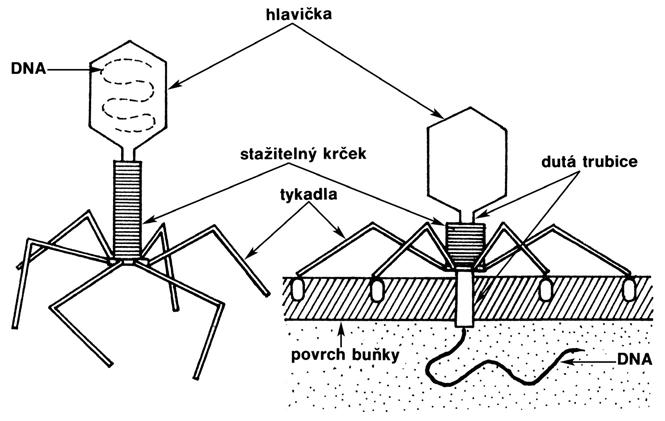 Jeden znejznámějších fágů má obal ve tvaru mnohostěnu, na nějž nasedá dutý stažitelný krček, zakončený příchytnými vlákny (obr. 54). Najdou-li tato vlákna specifické struktury na povrchu bakteriální buňky, smrští se krček afágová DNA se vstříkne do bakteriální protoplazmy. Všechny bílkovinné složky zůstanou venku – kinfekci buňky tedy stačí virová nukleová kyselina.